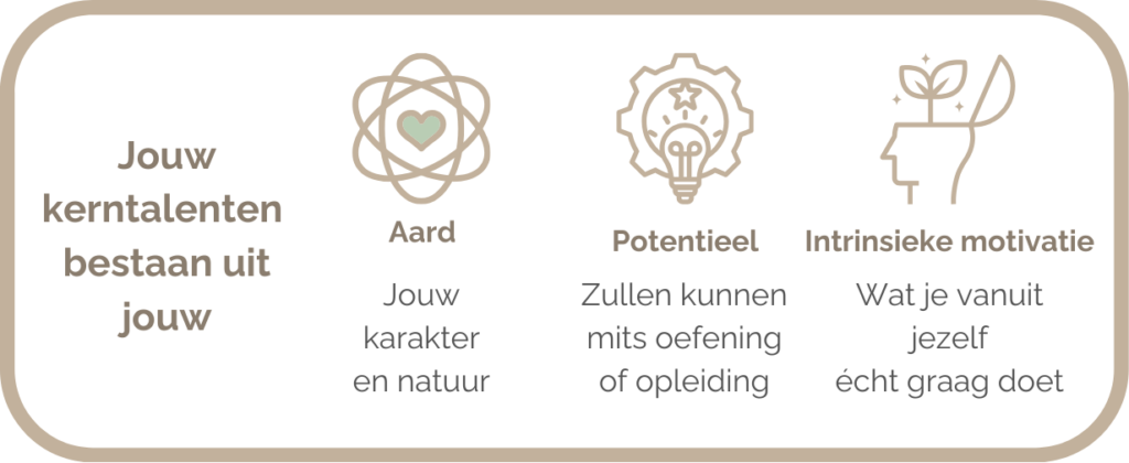 Iedereen heeft 23 kerntalenten. Die kunnen sterk, half of klein zijn. Hoe sterker een kerntalent, hoe meer je het gewoon wil uitleven! Je krijgt er energie van, het is dan ook belangrijk te weten welke sterke kerntalenten je hebt zodat je deze in het dagelijks leven kunt gaan inzetten. Een klein kerntalent kost juist energie, die wil je zo min mogelijk hoeven inzetten.